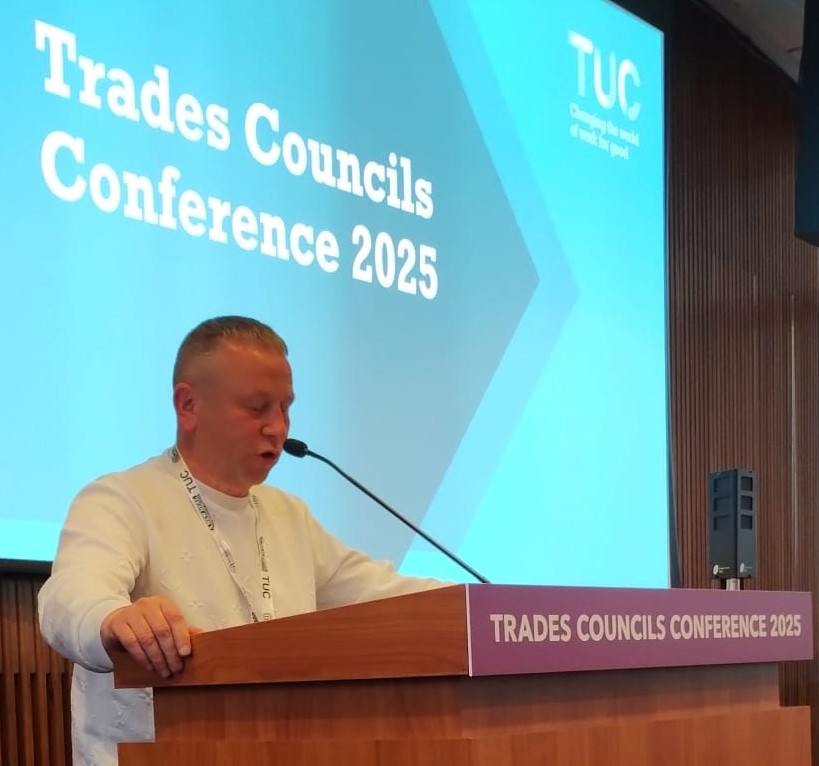 Mike Master striker speaking at 2025 Trades Union councils conference £385 raised by delegates.