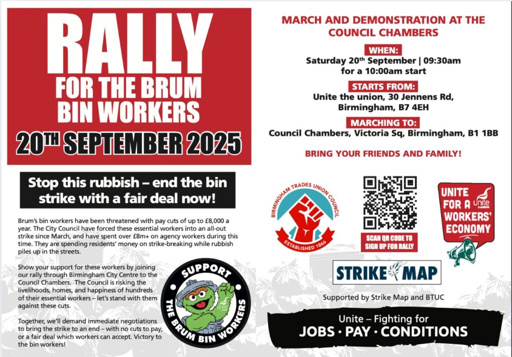 Friday 26th September 2025 – West Midlands Fire Brigades Union is proud to stand shoulder-to-shoulder with Unite the Union in hosting a special solidarity event for Birmingham Bin workers, their families, and members of the public who wish to show their support. Everyone will be welcome!