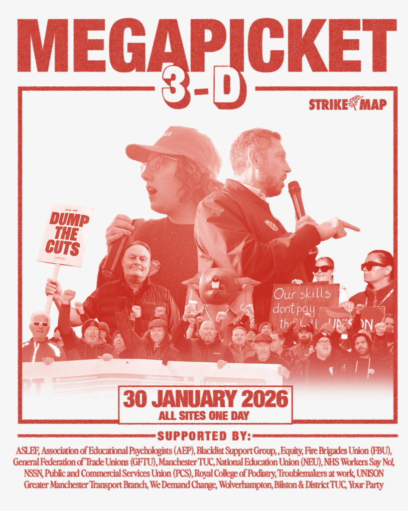 Friday 30th January 2026 from 6am Megapicket 3 closed all five sites. Wolverhampton TUC joined the strikers at Perry Barr Depot