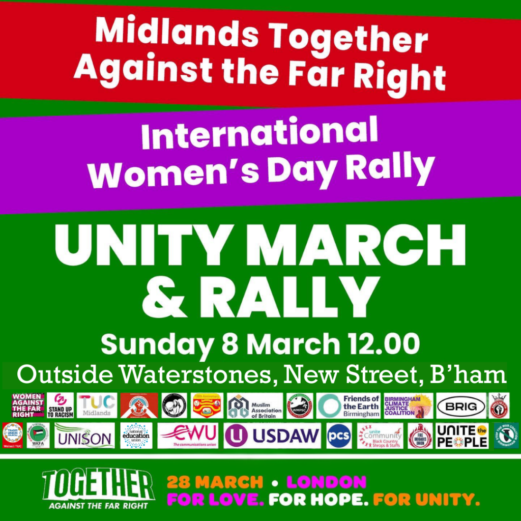 Sunday 8 March 2026 – West Midlands Together Against the Far Right on International Women’s Day