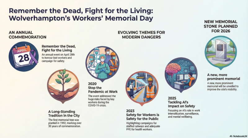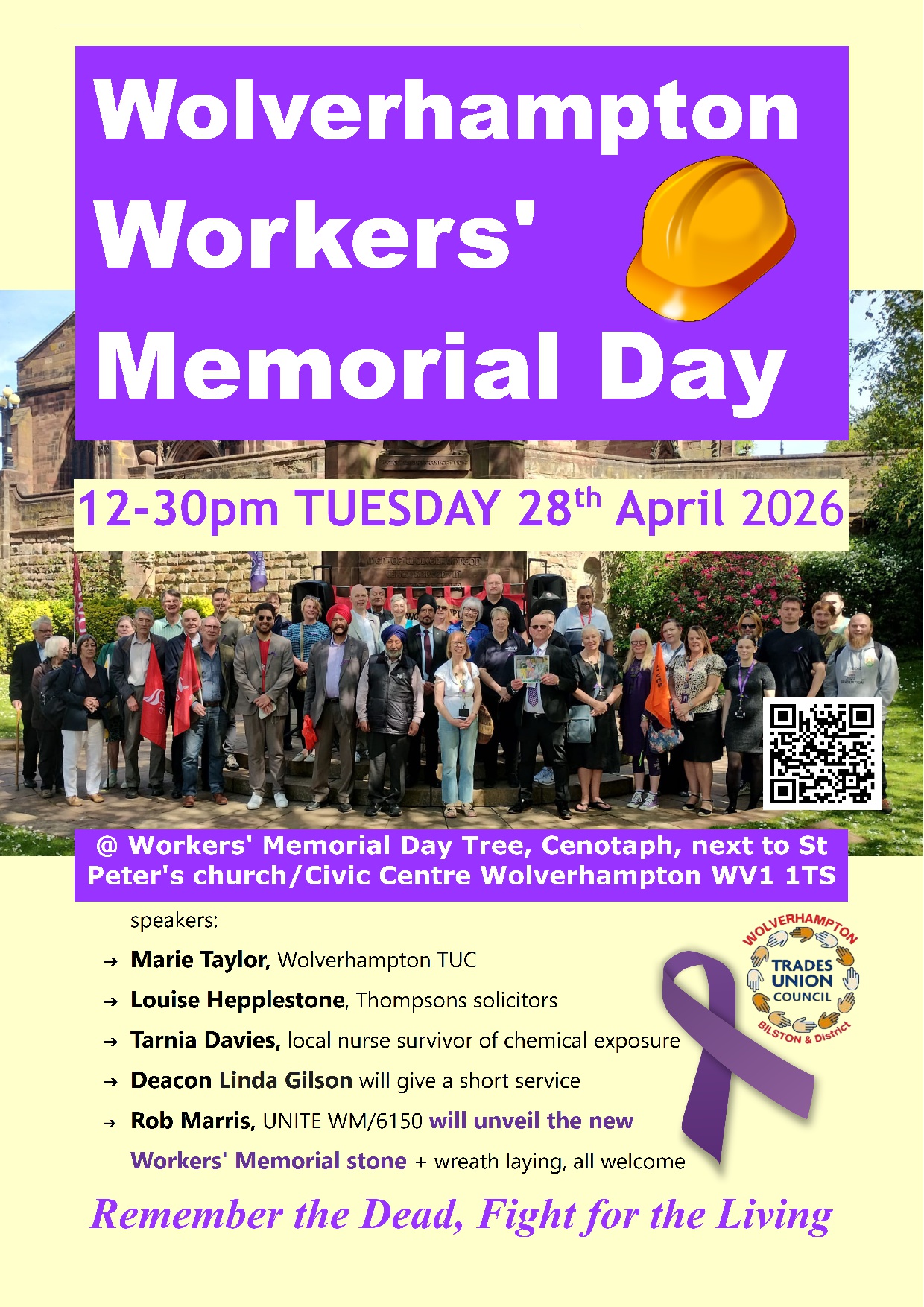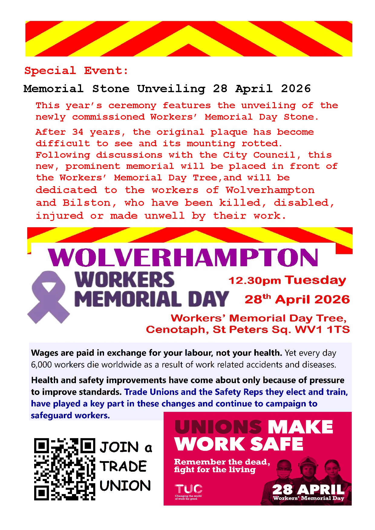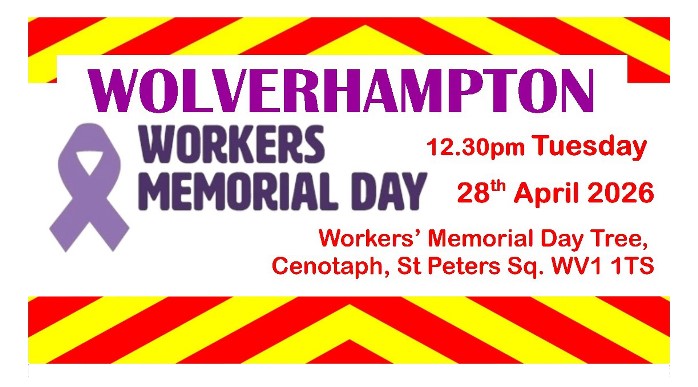 12.30pm at the Workers’ Memorial Day Tree, Cenotaph, St Peters Square, Wolverhampton WV1 1TS